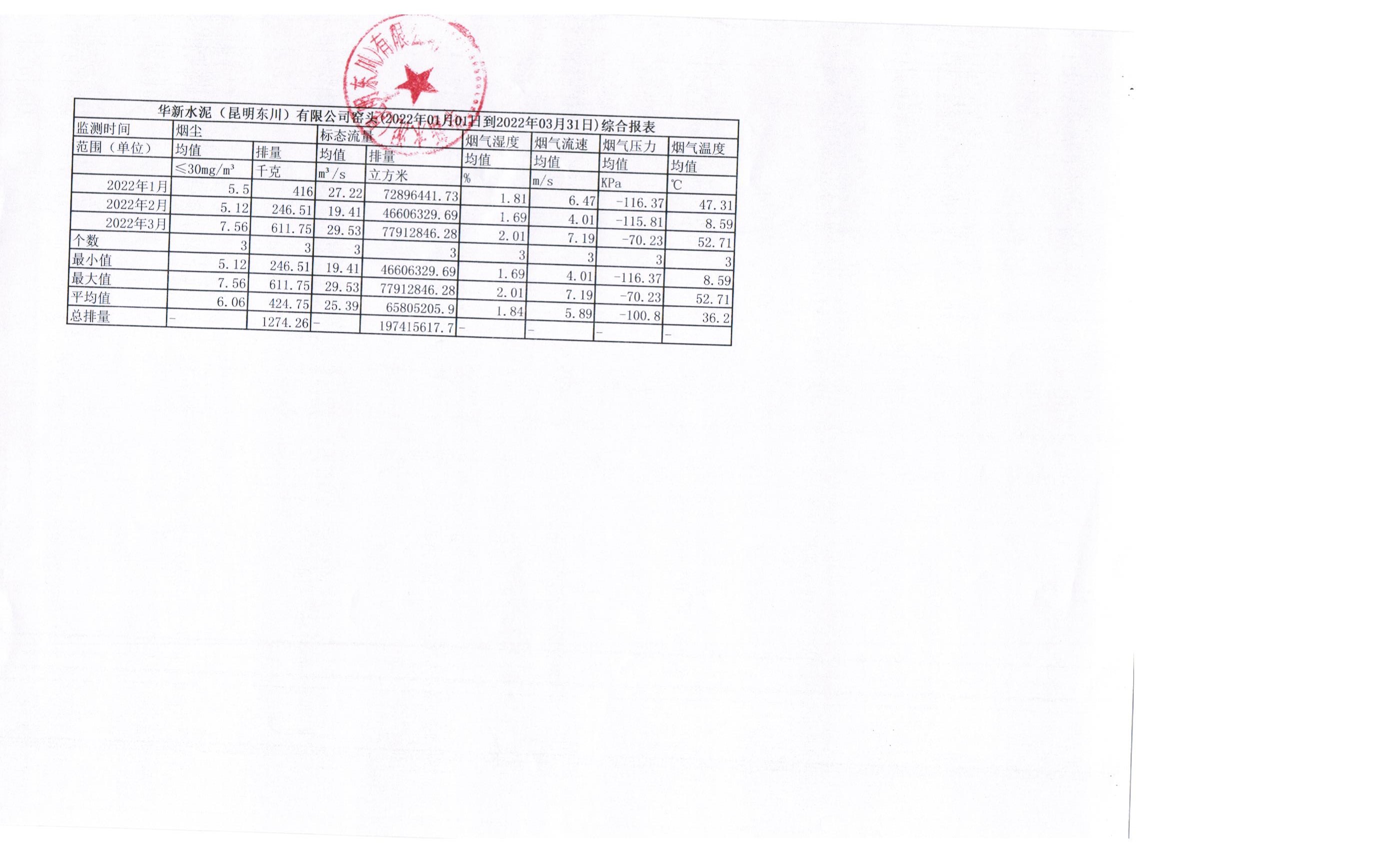 4、華新水泥(昆明東川)有限公司2022年第一季度窯尾煙氣在線監(jiān)測(cè)月平均值季報(bào)表